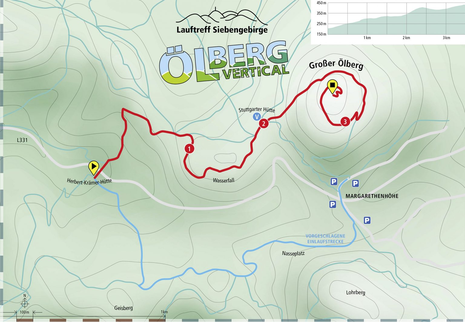 ca. 3,5 km, ca. 250 Höhenmeter. Es handelt sich beim Bergsprint „ÖlbergVertical“ um eine landschaftlich reizvolle, aber anspruchsvolle Strecke mit langen, knackigen Anstiegen, die Lauferfahrung im Gelände und eine gute Kondition voraussetzt. Die Strecke wird markiert! An einigen Stellen weisen Ordner den Weg.